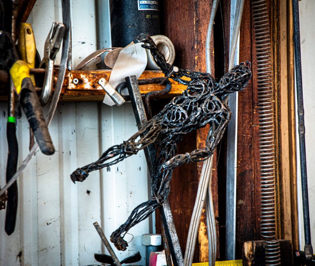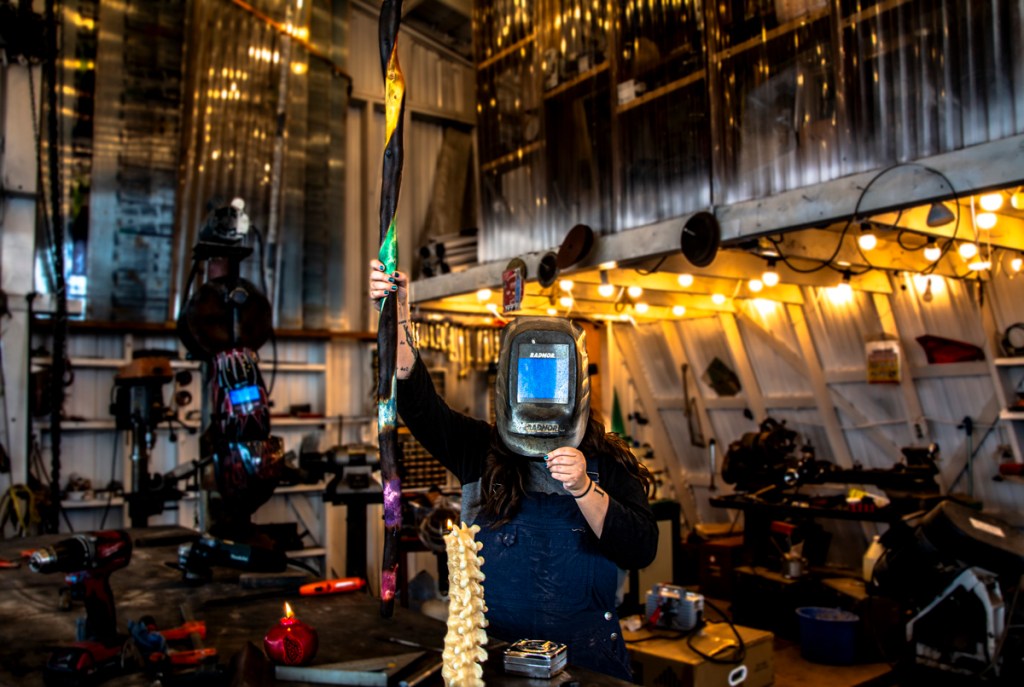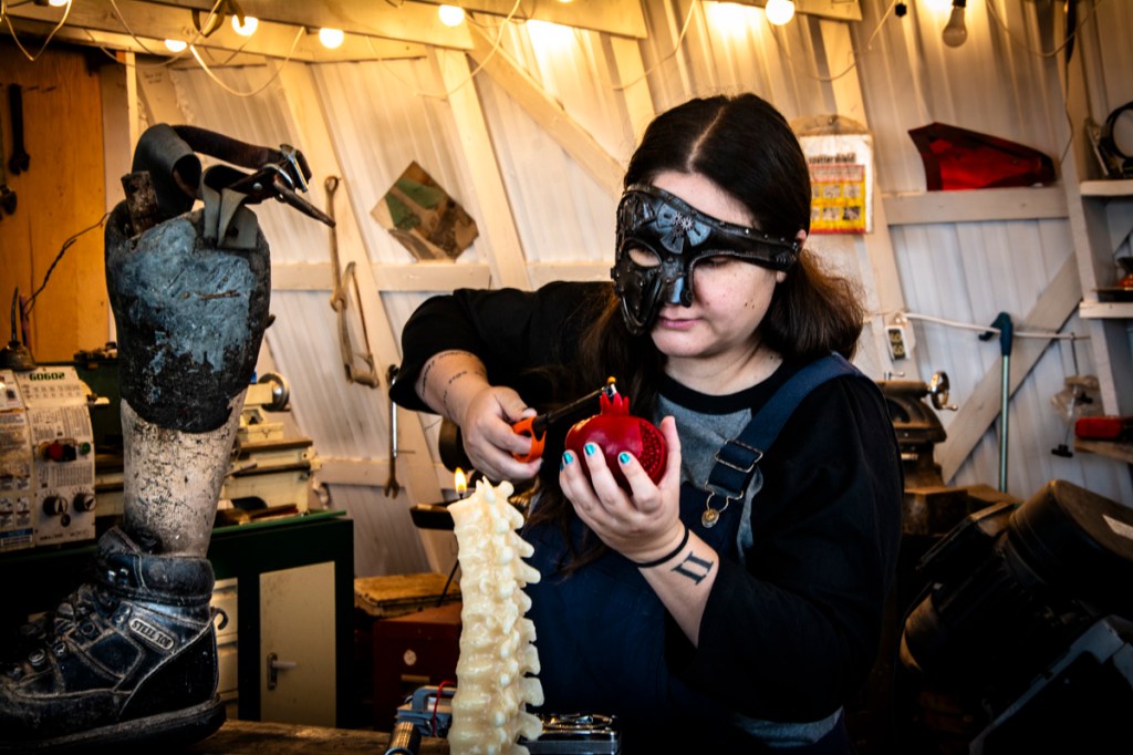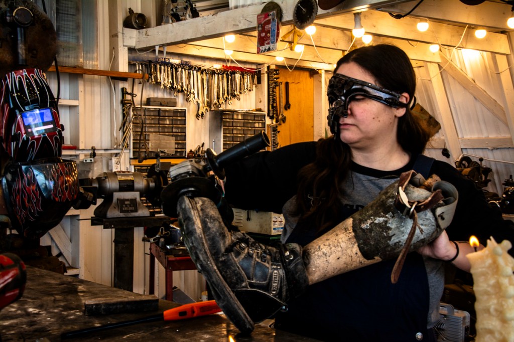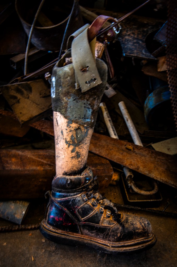 “Hephaestus’s Workshop”- this was an assignment for a class Miriam Sagan and I took together, “Feminism and Photography,” taught by Laura Larson. The assignment was to do a performative portrait. We got to have some fun while delving into themes that are important to us – disability representation, being a woman in male-dominated spaces, and what it means to create/inhabit a body! Uncle Willie’s leg is guest starring.