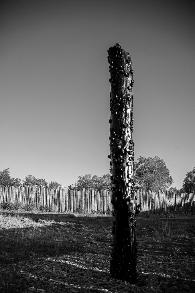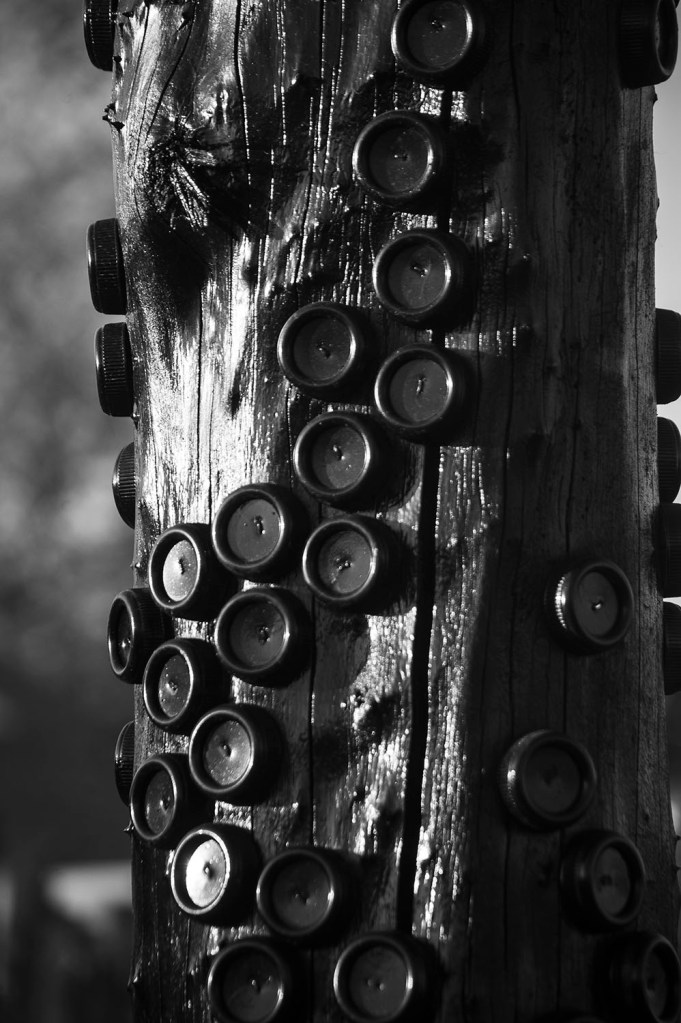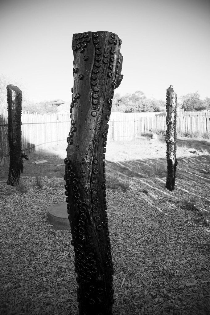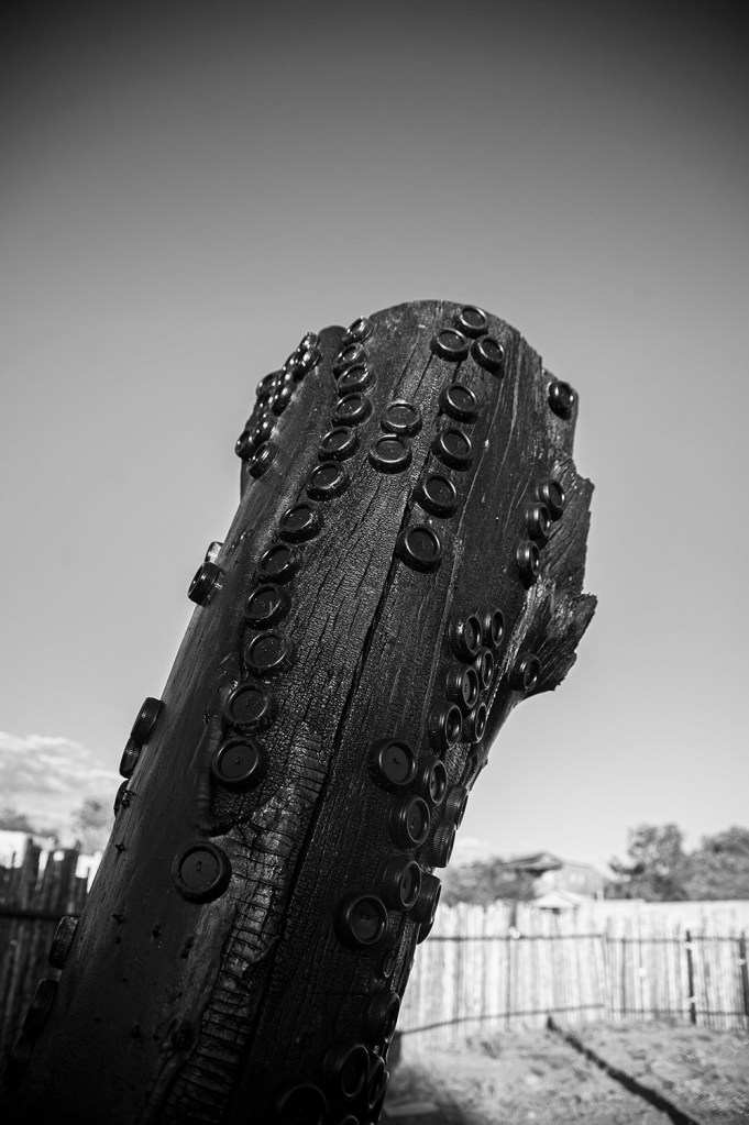 Installed in Santa Fe’s “Poetry Yard” in 2021 and made entirely of recycled materials, this land art project helps direct rainfall by incorporating a dry pond. The sculpture’s relationship with the land may change over time- will the wood rot when exposed to water? Or will it remain an ever present reminder of fire and drought? As our climate changes, the sculpture may reflect that change on a local level. Along with the ambiguity and anxiety of climate change, “Desiccation: Dormancy: Deluge” brings up issues of human consumption and how different organisms feed. The sculpture takes inspiration from saprophytic fungi (mushrooms that consume dead wood) and the twin processes of parasitic and symbiotic growth. The plastic and dairy industries are an ambiguous two-edged sword- using unsustainable environmental practices while at the same time greatly expanding human access to food and vital resources. So the question is: how do we achieve a balance between human needs and biological destruction?