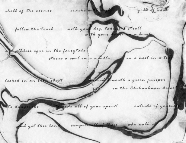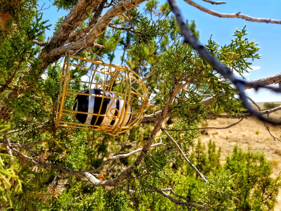 Poetry art walk- a geocached art project that was available in Santa Fe from July-September 2017. It was installed on a walking trail at Santa Fe Skies RV Park. Each piece consisted of a golden cage, a hand painted egg, and a scroll of suminagashi and poetry. Each piece led to the next, and reflected the landscape of northern New Mexico.